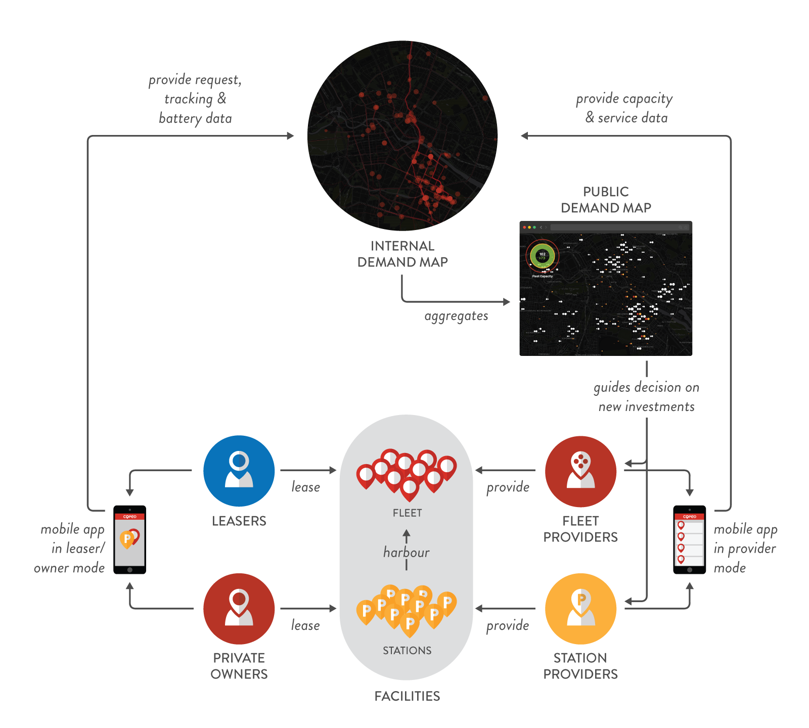 The concept is based on crowdsourcing the vehicles as well as the charging infrastructure. It incorporates a mobile app for users of the Copenhagen Wheel which contains